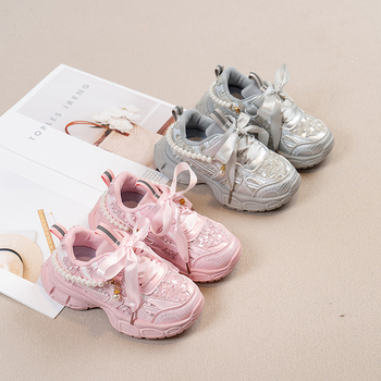 Otoño 2024, zapatillas deportivas de suela blanda con flores de encaje de perlas a la moda para niñas